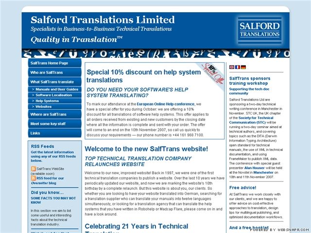 Manchester tech doc conference: Technical translation specialists Salford Translations Ltd are the headline sponsors of a two-day technical documentation conference in Manchester in November. STC UK, the UK chapter of the Society for Technical Communication (STC) will be running a two-day seminar aimed at technical authors, and covering topics such as the DITA (Darwin Information Typing Architecture) open standard for technical manuals, the use of XML in technical documentation, and using FrameMaker for round tripping to publish XML data. The conference with special guest presenter Alan Houser will be held at the Novotel in Manchester on 10th and 11th November 2007. Discounted booking rates for delegates are available until 19th October 2007, so book early!